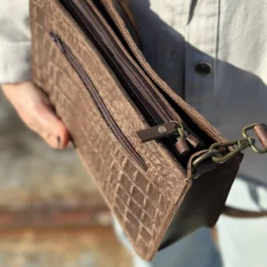 Αυτή η καφέ χειροποίητη δερμάτινη τσάντα ώμου έχει:
